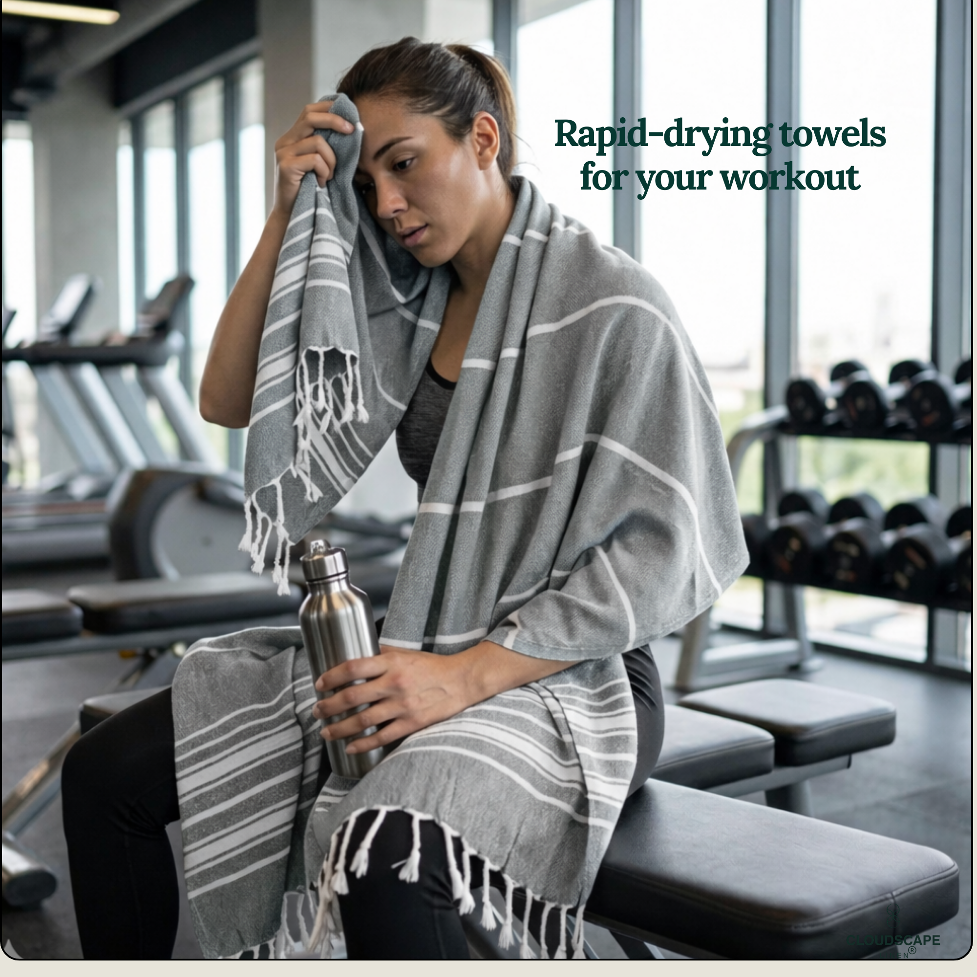 The timeless stripe detail makes these perfect as a stylish wrap, a picnic blanket, or a poolside throw.